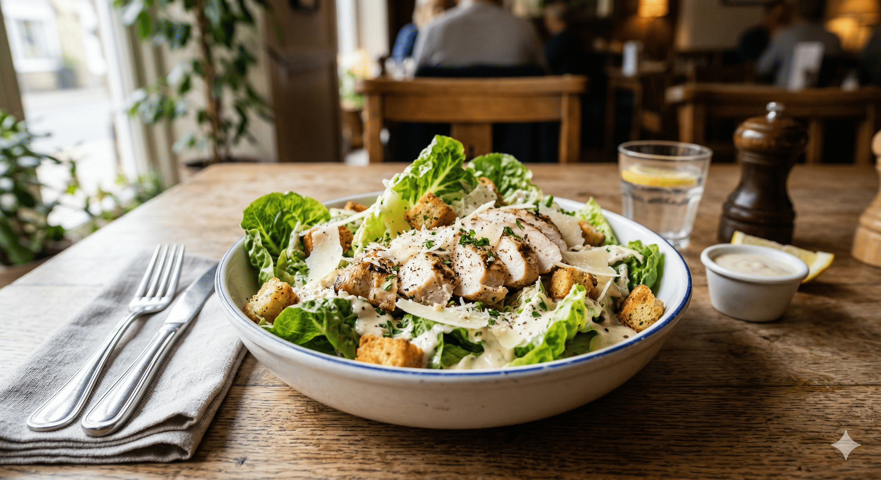 Tavuk Göğüs, Sezar Sos, Göbek Marul, Çeri Domates, Salatalık, Havuç, Mısır ve Dilim Zeytin